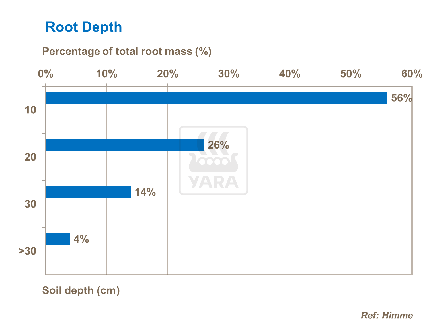 Short term waterlogging is tolerated, but high water tables, especially if salty, as in the Mekong Delta of Vietnam, will limit root development and hence production. The soil pH range should be between 5.0-7.0 in the top 10-20cm. Production is severely limited below pH 4.5 and also above 8.0. Low soil pH at depth can also be a problem, particularly in established crops.