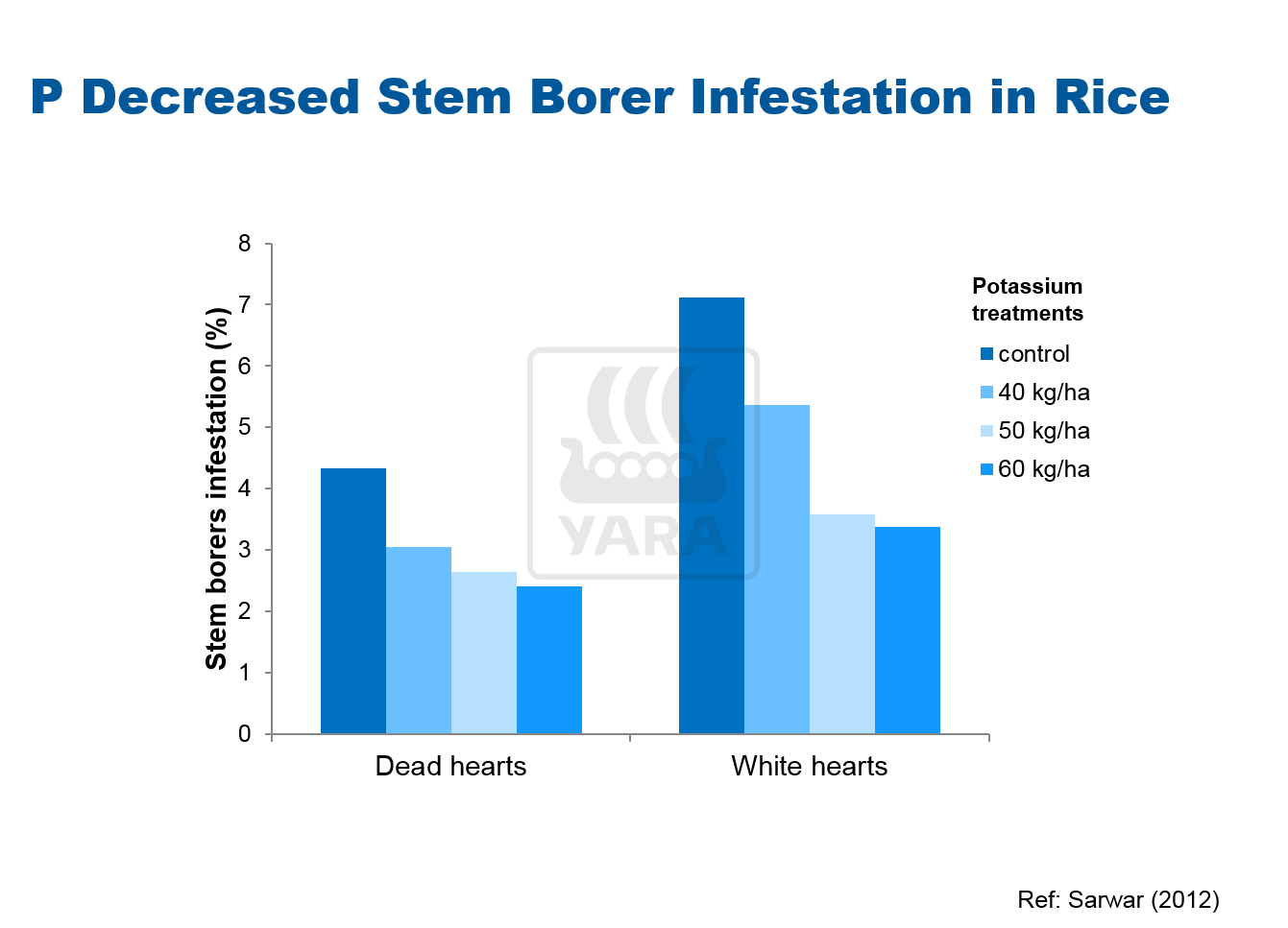 K fertilizer is widely reported to decrease insect infestation and disease incidence in many host plants. For example, researcher showed that potassium application decreased the infestation of rice by stem borers. Stem borers can destroy rice at any stage of the plant from seedling to maturity. They feed upon tillers and causes deadheart or drying of the central tiller, during vegetative stage; and causes whiteheads at reproductive stage.